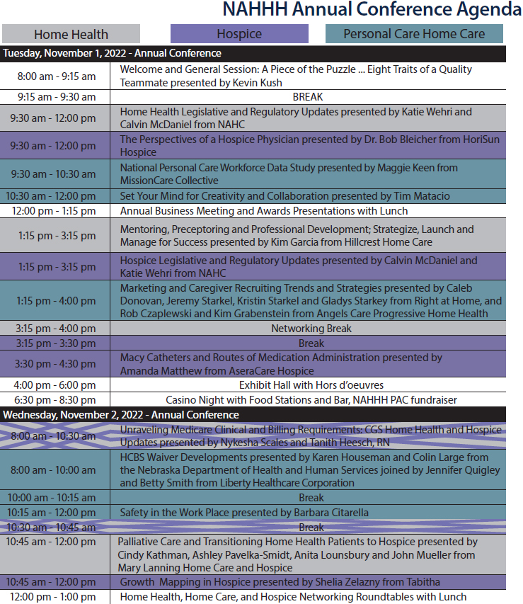 Connect with home care, home health and hospice professionals across Nebraska to network and learn. Attend our Annual Business Meeting to receive updates on how the association is serving you and join us in recognizing award recipients. You’ll receive the latest federal regulatory and legislative updates; prepare for OASIS-E implementation; learn new ways to care for hospice patients with a variety of healthcare needs; learn about the latest workforce trends; take away new ideas for caregiver marketing and recruiting; implement the latest clinical and billing requirements; get questions answered about serving Medicaid waiver clients; learn how to implement a mentoring, preceptoring and professional development program; develop a plan for transitioning home health patients to hospice; and much more. Meet with our industry partners in the exhibit hall to learn about the latest products and services to serve clients and patients.